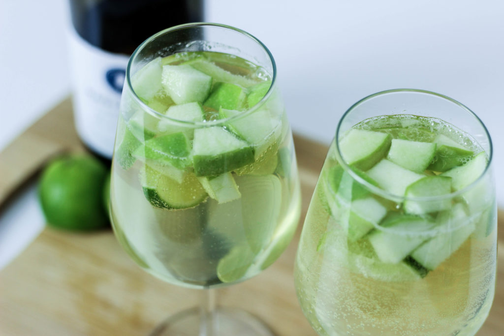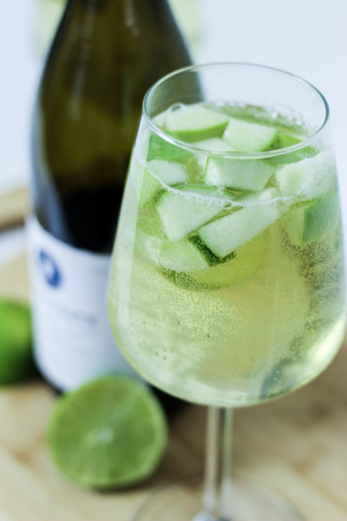 Begin by filling your glass with a handful of diced green apples and small lime slices. Pour half the can of seltzer water over the fruit. Top with Magistrate Chardonnay. Garnish with lime slices if you wish! (Makes 2 drinks)