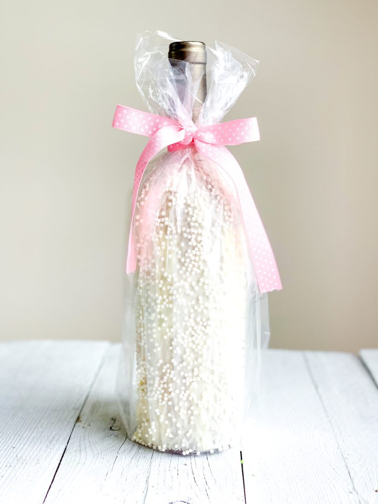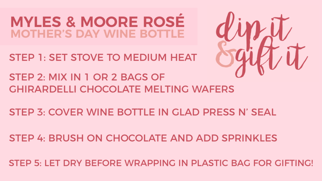 As you can see, the process is super simple! In a little more detail, here’s what you’ll need to do: Set your burner to med-high heat. Pour your melting chocolate into your pot and stir every minute or so until smooth. While your chocolate is melting, take your plastic wrap and wrap your bottle, leaving the top open. In this particular case, we used our delicious Rue de Pearl Rosé. Ensure that the plastic goes all the way to the bottom and wrap it underneath, so as to keep the chocolate from touching the actual bottle. Now, you’re ready to dip (or in our case, paint!) We used a silicone basting brush to essentially “paint” on the chocolate which made the process SO easy, but you can use whatever you’d like. At this point, take the basting brush in the chocolate and paint your bottle and again, leave the top clean. We went around the bottle a few times to get the chocolate nice and thick, but this is a total preference thing. You can’t really mess this up, we promise! Lastly, while the chocolate is still melted, add your sprinkles for the perfect finishing touch! After this, let your chocolate dry (about 5-10 minutes in the freezer will do the trick!) Once dry, wrap your adorable bottle in a plastic bag, tie a ribbon around the top, and RUN to your mom with it. Or your mom friends. You get the jist. Regardless — it is SO. DANG. SIMPLE! Check out the video at the end of this post to see for yourself!