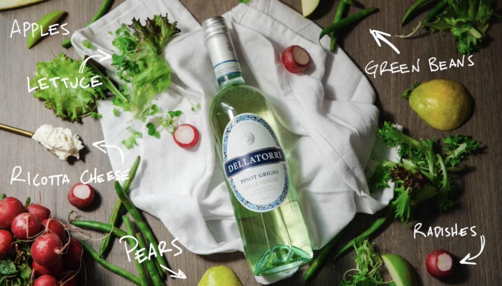 Next up is our Dellatorri Pinot Grigio. This lovely Italian gal shows off with her citrus, mineral, and flint aromas and abundant fruitiness. And in the hot summer heat that we’re in right now, we think it’s the perfect wine to chill next to your charcuterie board! Speaking of — if you’re doing a little charcuterie with this one, we highly suggest adding some veggie flavors — lettuce, green beans, radishes — and complimenting those with some fruity additions like apples and pears. And of course, don’t forget the cheese! Ricotta is the perfect pairing for this wine!
