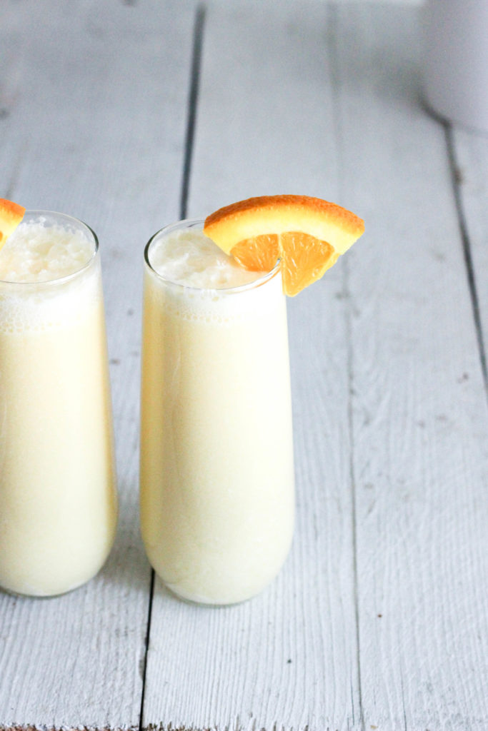 It’s honestly a normal mimosa, with the addition of heavy cream. We started by pouring our OJ into a champagne flute, followed by the heavy cream, and topped with our Prosecco. As far as amounts, you can kind of eyeball it & adjust to taste. We, of course, are big believers in more Prosecco than OJ, but you do you! Garnish with orange slices and enjoy! SO smooth, so delicious.