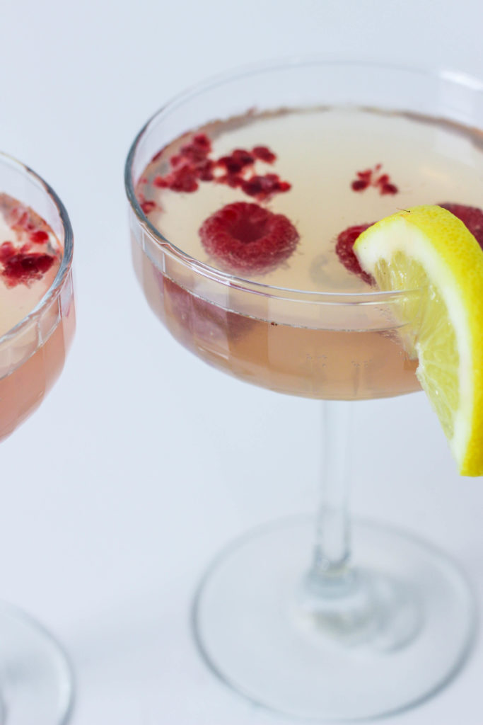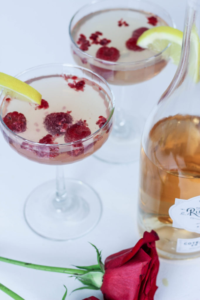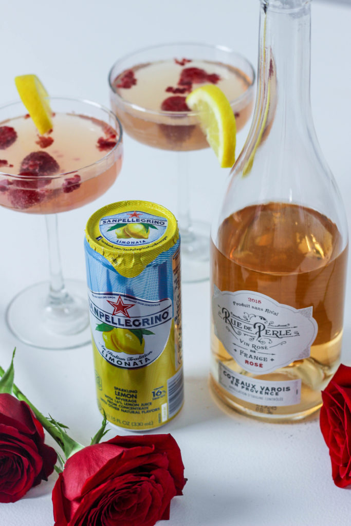 After reading that ingredients list you probably already realize how darn simple this is going to get, don’t you?! This is all you gotta do: Start with a handful of raspberries and drop them into your glass. You could muddle them if you prefer that, but we went with whole berries. Over the berries, pour your Limonata about halfway up the glass. Top with Rue de Pearl Rosé and garnish with a lemon slice.